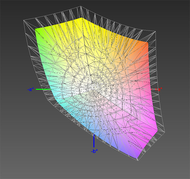 (barevný prostor je sRGB a bílá mřížka to, co monitor přesahuje)